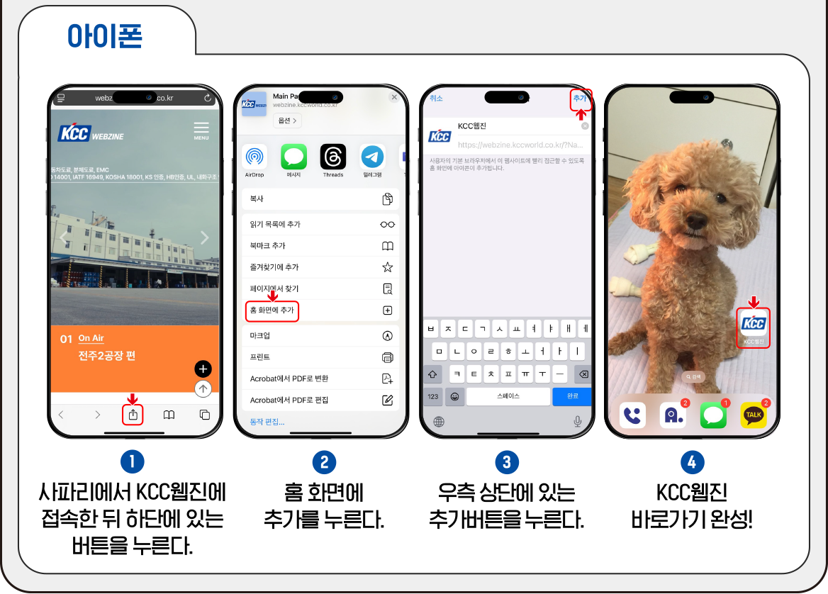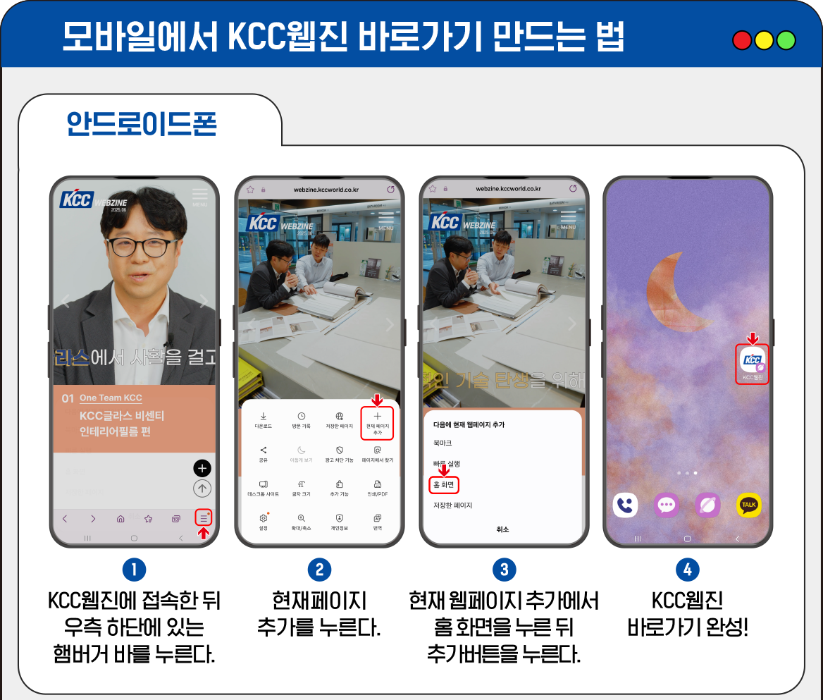 모바일에서 KCC웹진을 바로 만나고 싶은 KCC 구성원 여러분! 모바일에서도 KCC웹진을 이용할 수 있다는 사실 알고 계셨나요? 모바일에서 KCC웹진에 접속하면 로그인 기능, 출석체크 기능, CC포인트 적립 등 다양한 기능을 더욱 편리하게 이용할 수 있어요. 쉽고 간편하게 KCC웹진 바로가는 법, 함께 알아볼까요?