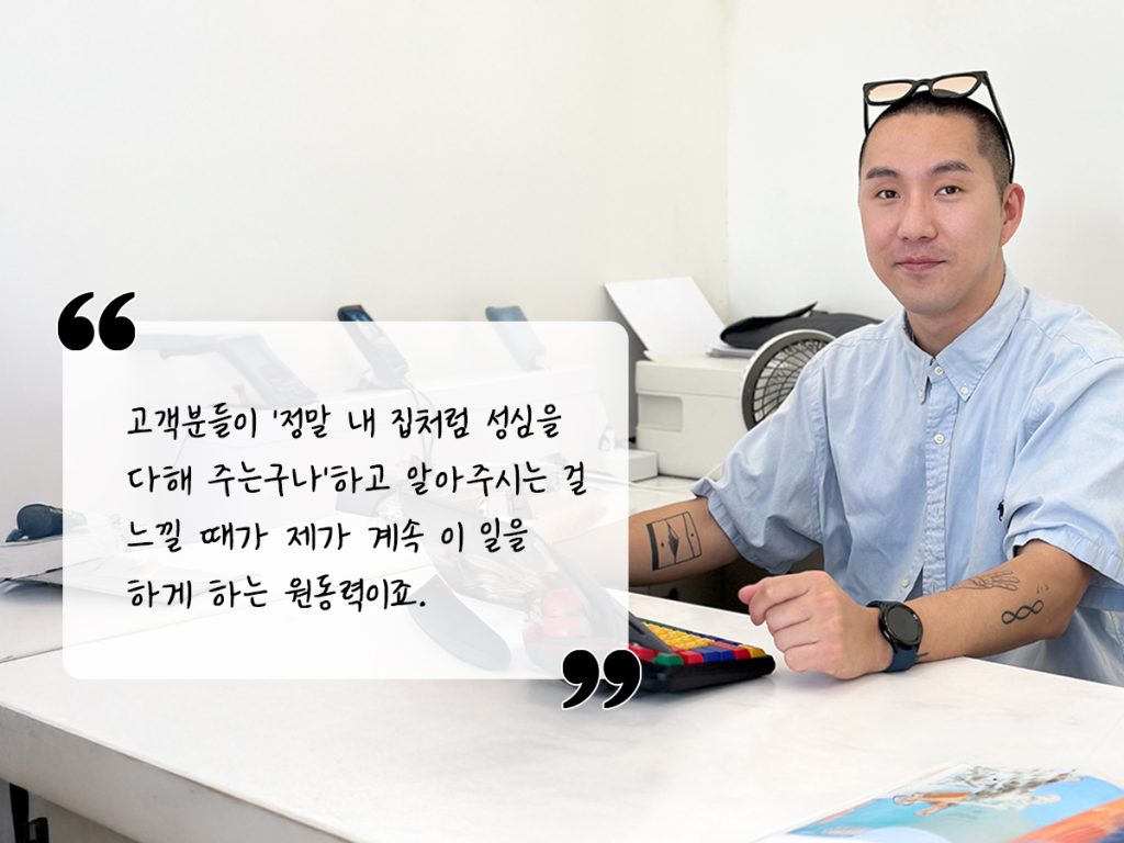 “‘예쁜 집, 마음에 드는 집을 만들어드리자’라는 마음 하나로 지금까지 왔습니다. 진심을 다하면 그 마음이 고객분들한테도 전달된다고 믿어요. 저희 작업을 보신 고객분들이 ‘정말 내 집처럼 성심을 다해 주는구나’하고 알아주시는 걸 느낄 때가 제가 계속 이 일을 하게 하는 원동력이죠.”