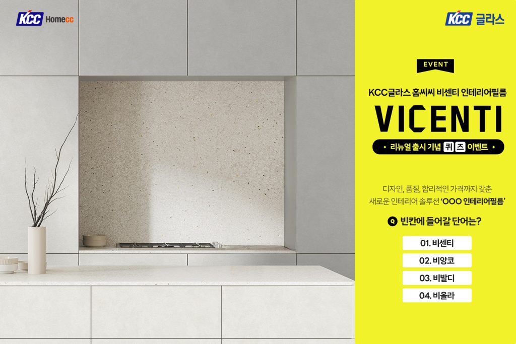 KCC글라스(케이씨씨글라스, 대표 정몽익)는 인테리어 전문 브랜드 ‘홈씨씨’가 인테리어 표면 마감재인 ‘비센티(VICENTI) 인테리어필름’의 리뉴얼 출시를 기념해 SNS 퀴즈 이벤트를 진행한다고 27일 밝혔다.