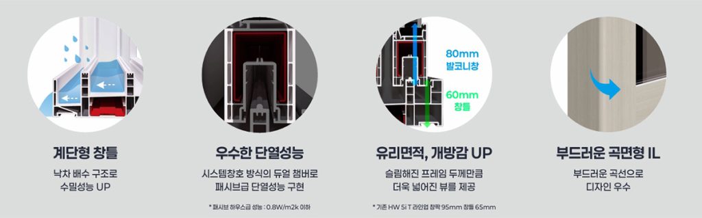 프레임 설계는 단열과 기밀, 구조 성능을 모두 고려했다. 시스템 창호 방식의 듀얼 챔버가 적용된 창짝 구조로 열 손실을 줄였고, 고강도 보강재를 삽입해 창호 전체의 내풍압 성능을 강화했다. 특히 창짝과 창짝이 맞물리는 여밈대 내부에는 U자 절곡형 보강재를 적용해 강한 바람에도 뒤틀림과 떨림을 방지했다. 발코니 이중창 기준으로 내부 창짝과 창틀이 닿는 부위에는 이중 모헤어를 적용한 덕분에 기밀성도 끌어올렸다.