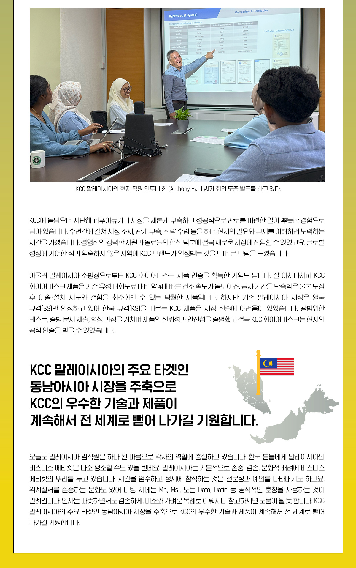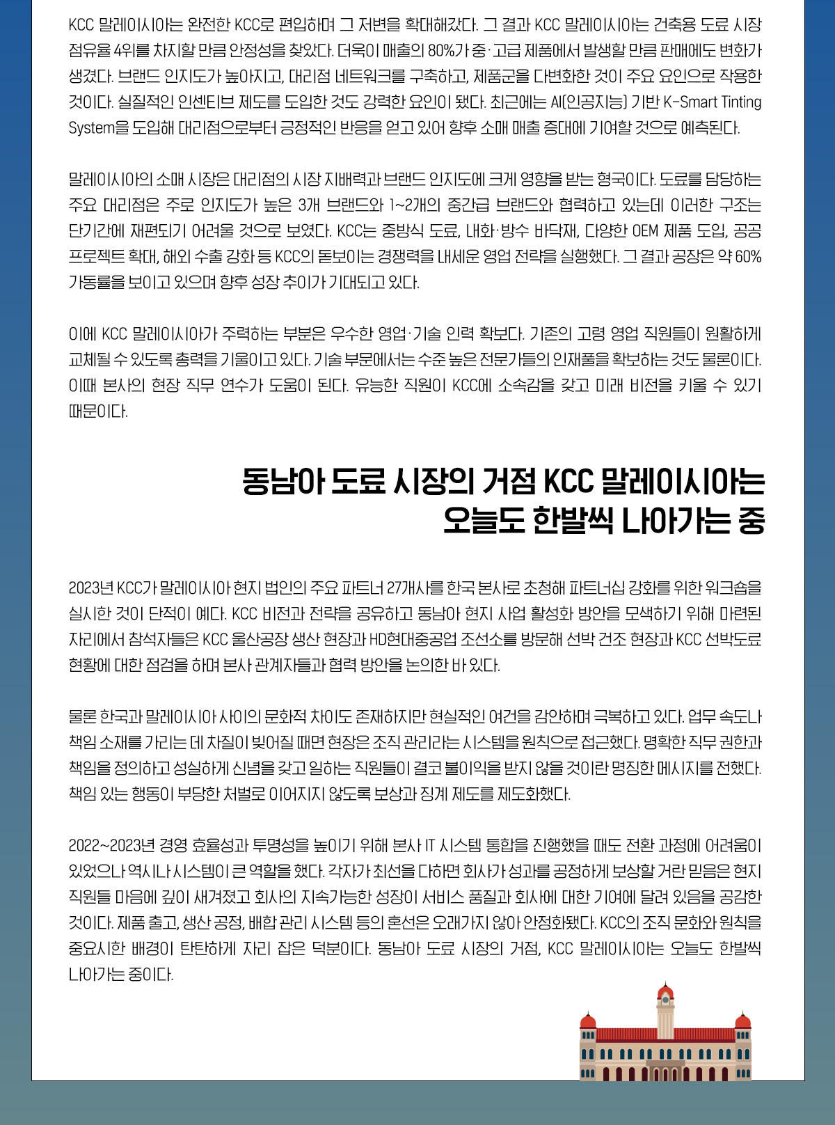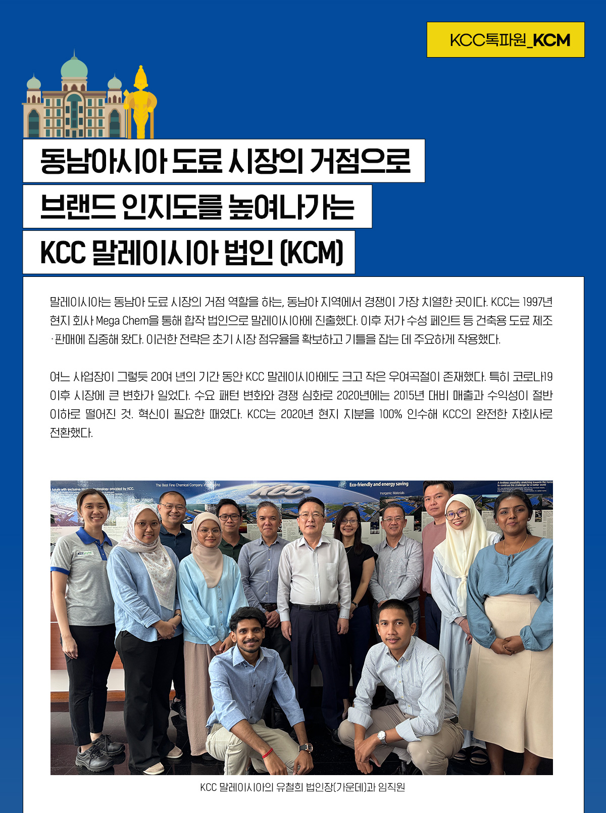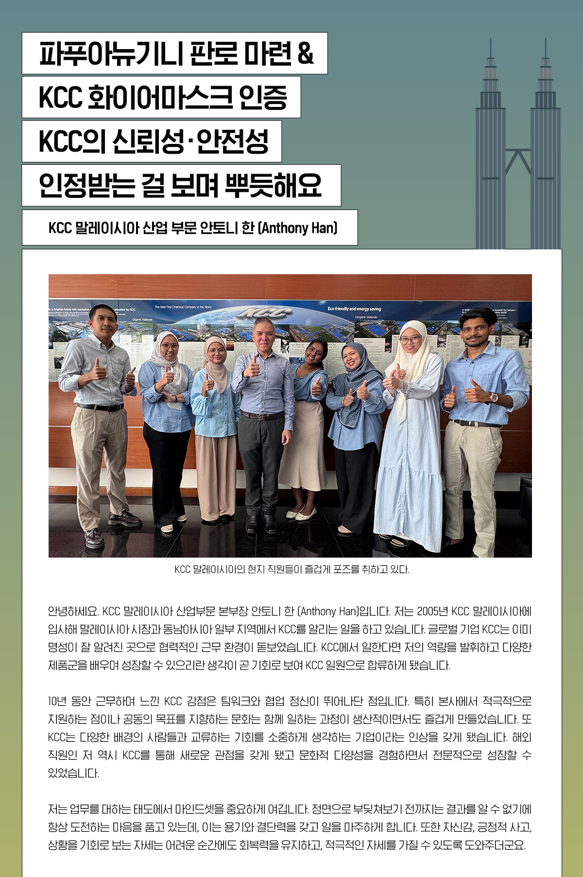 글로벌 기업 KCC는 전 세계 여러 나라에서 다양한 현지 법인을 운영하고 있습니다. 이곳에서 한국인 직원과 현지 직원들이 함께 어우러져 KCC의 내일을 만들어 갑니다. 바다 건너 먼 나라에서 열정적으로 일하는 KCC 구성원들의 재미있고 따뜻한 이야기를 ‘KCC 톡파원’을 통해 만나보세요!